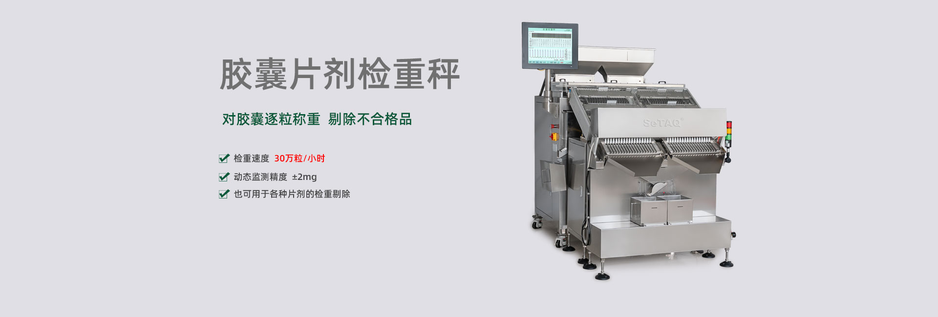 擁有近百項檢重專利和專有技術(shù),開發(fā)的產(chǎn)品可高速、高精度地檢測膠囊、片劑、丸劑、軟袋、軟管、紙盒、藥瓶、紙箱、薄片及各種器械、零件的重量偏差或缺件
